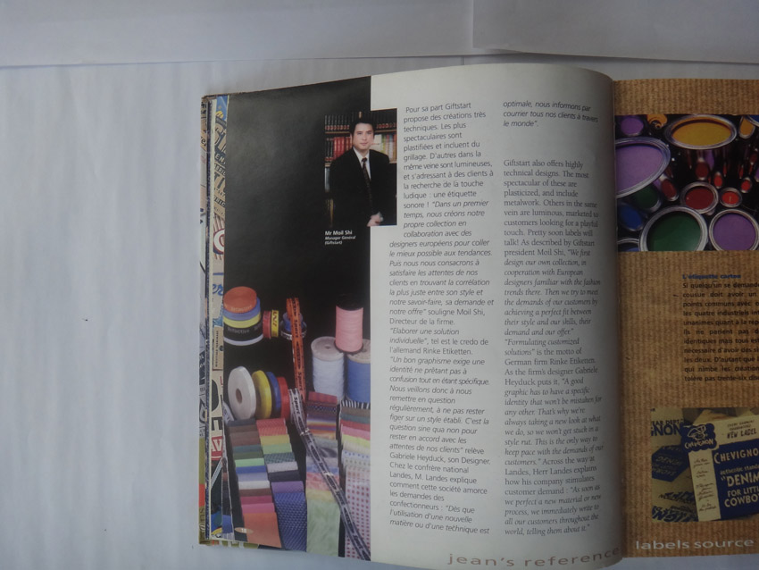 我們的產品已成功地行銷至世界各地,並獲得好評,許多歐洲著名設 計雜誌,如: Sacha Pacha, Looker, Le Clothing Label Book, Jeans reference label source book, Jeans Label Book and Logo Symbol Design, Jeans Encyclopedia..等專業性雜誌均定期與我們合作出版刊物。